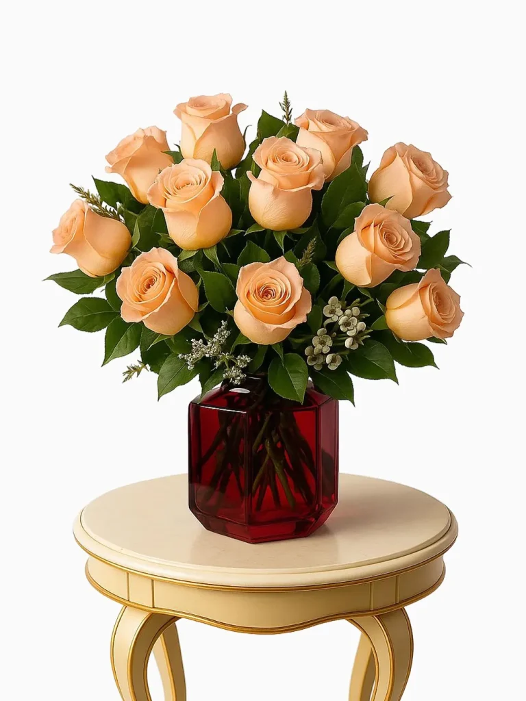 This 1 Dozen Rose Floral Piece pairs soft blush roses with a deep red glass vase, offering a romantic yet understated gift perfect for meaningful occasions.