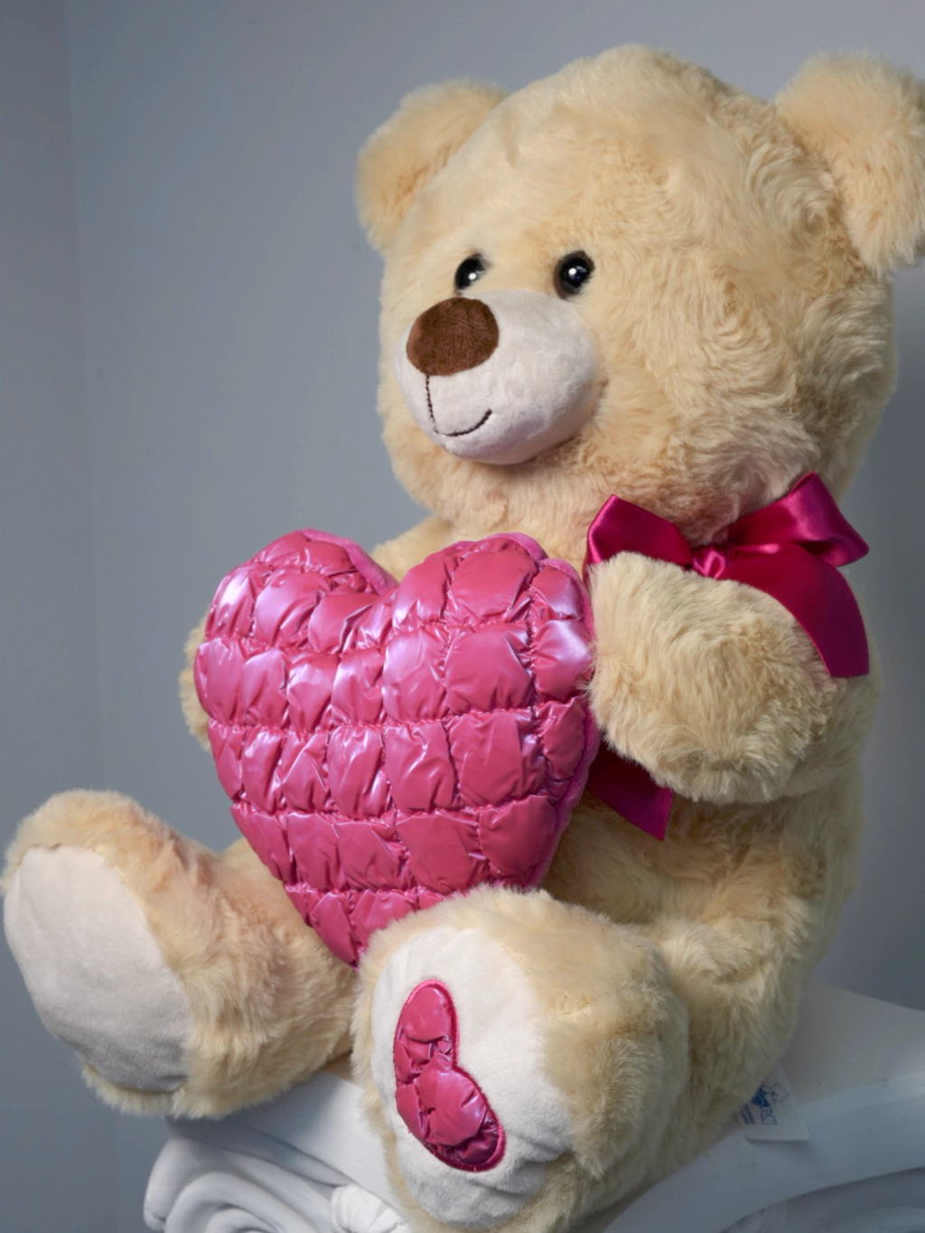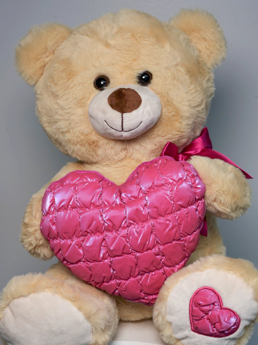 A soft and charming plush teddy bear holding a quilted pink heart, thoughtfully designed to express warmth, affection, and lasting love. Finished with elegant satin details, this heartfelt gift creates a comforting and timeless expression of care, perfect for meaningful moments and sweet celebrations