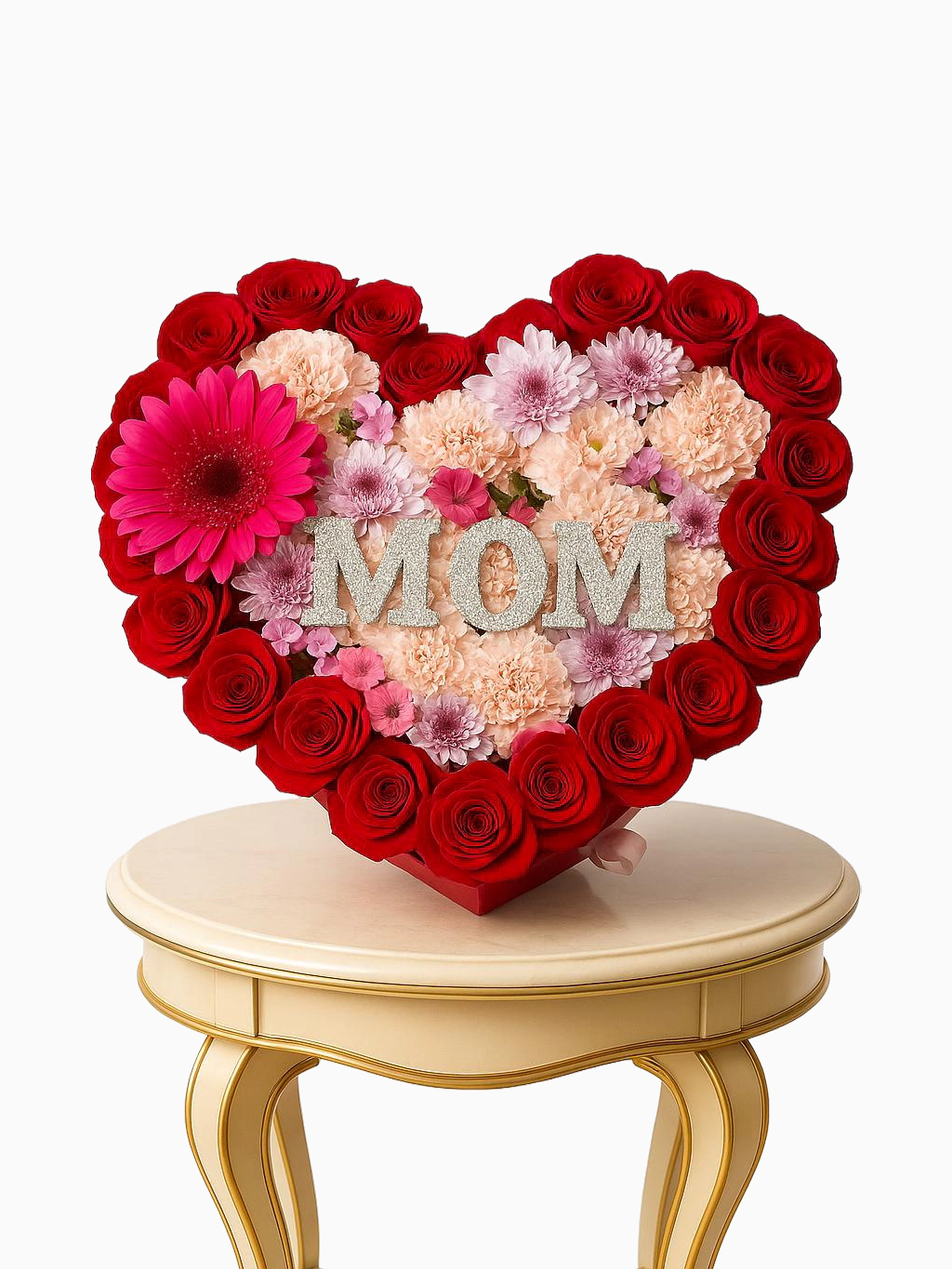A heart-shaped floral box filled with red roses, carnations, and delicate mixed blooms,crafted to say “I LOVE YOU” to Mom in the most beautiful way.