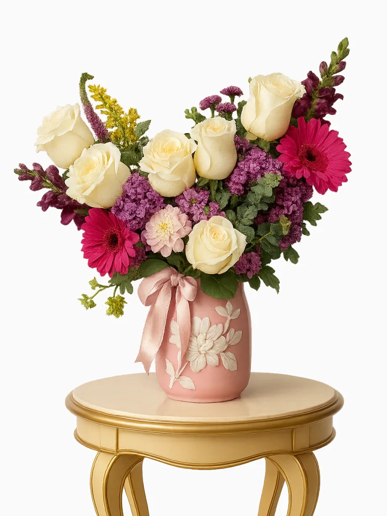 For those who prefer thoughtful gifts over flashy ones, the Large Rosy Charm Vase makes a lasting impression. It’s full of soft white roses and fluffy chrysanthemums, accented with garden-fresh flowers like dahlias, snapdragon, Veronica, and bupleurum. The palette leans into soft creams, gentle greens, and pastel pops, all styled in a smooth pink ceramic vase.