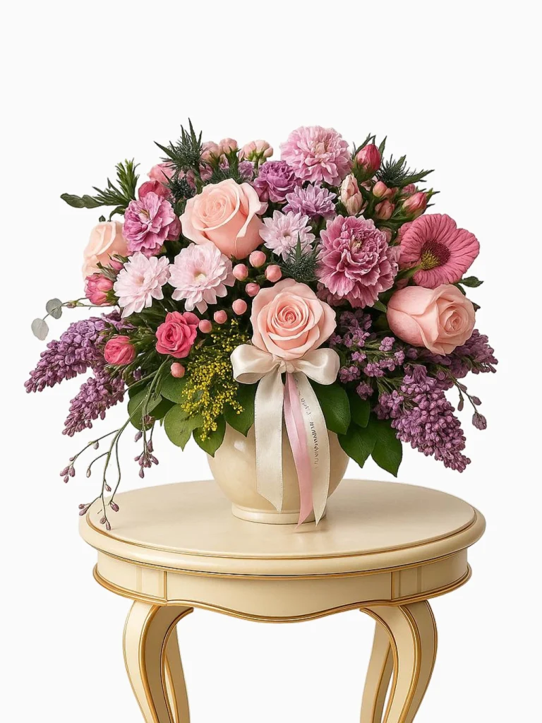 Carnations are often associated with admiration and gratitude, making them a favorite for Mother’s Day. Roses convey love and care, while lilac symbolizes renewal and the start of something beautiful. Combined with unique textures like thistle and eucalyptus, this arrangement tells a quiet story of appreciation and thoughtfulness.