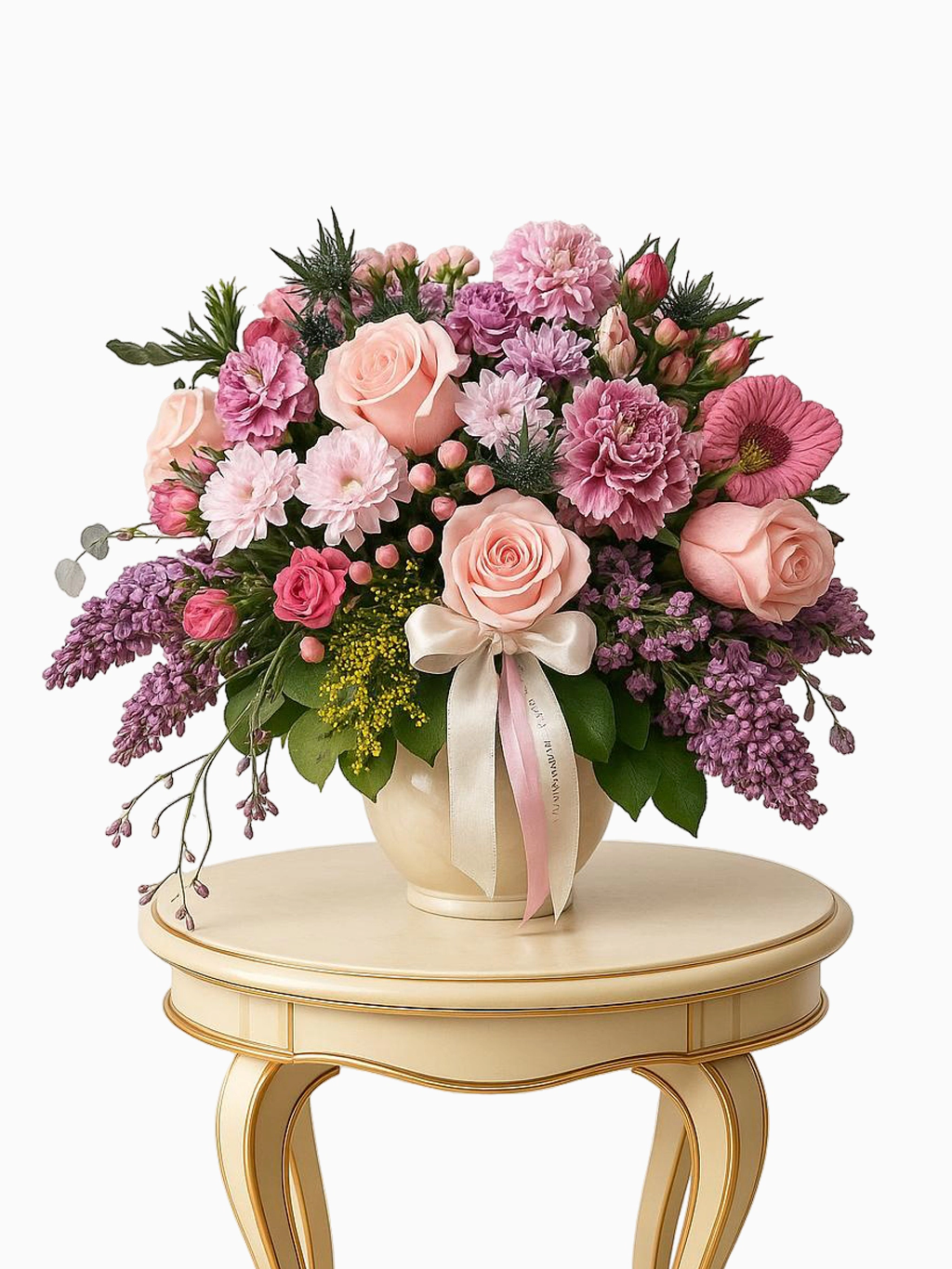 Pink roses set the tone with classic beauty, while carnations and spray roses layer in warmth and texture. Soft lilacs, solidaster, and wax flowers bring a sweet garden touch, and unexpected details like thistle, hypericum berries, and seeded eucalyptus add depth and movement. One standout bloom , the Lilac Eleonora Cremone , gives this arrangement its signature look.