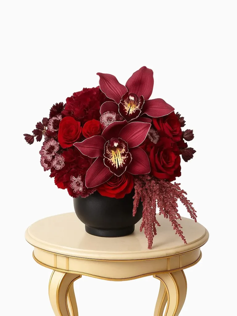 Strong color. Rich texture. Clear intention. The Passionate Orchid Bowl Arrangement leans into all three. Designed in a low matte-black ceramic bowl, this piece brings together velvety red roses, deep burgundy cymbidium orchids, and ruffled carnations, each bloom placed deliberately to create a sculptural and full-bodied look.