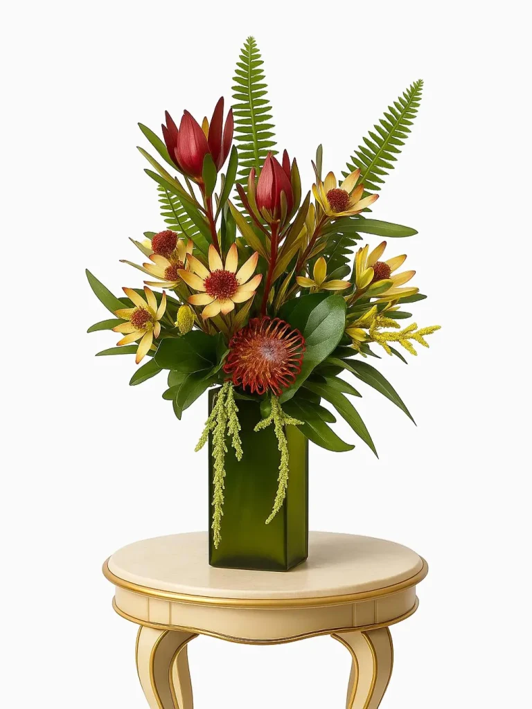 If you’re looking for something beyond the usual bouquet, this one stands in a category of its own. The Tropical Vase Arrangement features a curated mix of bold protea, fiery leucadendron, yellow orchids, solidago, amaranthus, and ferns—delivered in a sleek green vase that perfectly complements its vibrant contents.