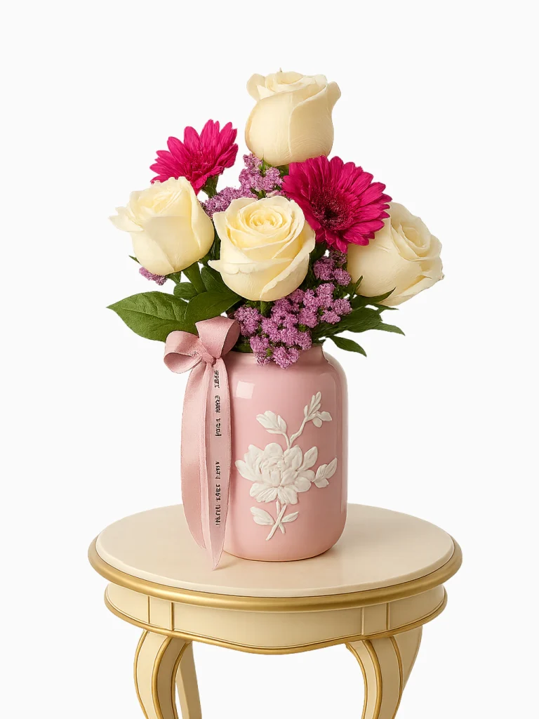 Looking for a gentle gift that still feels special? The White & Pink Small Rose Arrangement checks all the boxes. It’s compact, beautiful, and filled with hand-selected flowers that speak to sincerity and care.
